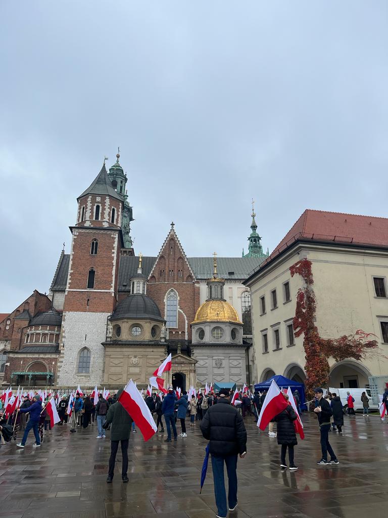 Abbiamo avuto la fortuna di visitare il Castello di Wavel il giorno della festa d’Indipendenza polacca (l’11 novembre), che commemora l’anniversario della nascita della Seconda Repubblica della Polonia nel 1918, per festeggiare la rinascita dello stato polacco dopo 123 anni di spartizioni. Nella piazza intorno al castello spiccavano centinaia e centinaia di bandiere bianche e rosse, sventolate da bambini, anziani, genitori, studenti.